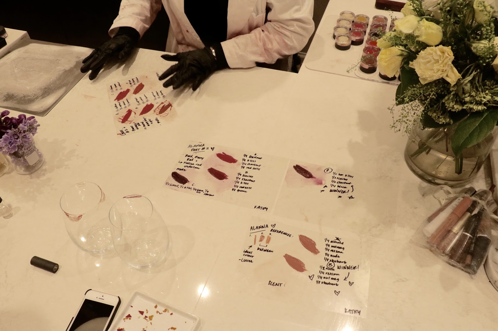After you and your artist consult they create the first batch of your lipstick, and you get to try it on. From there you provide comment -- too red, more pink, more nude, less brown, etc, and then your artist will make a second and third batch until you get the colour you want. While I was told that they will make as many versions as it takes for you to be happy, most people nail it down by the fourth or fifth round.